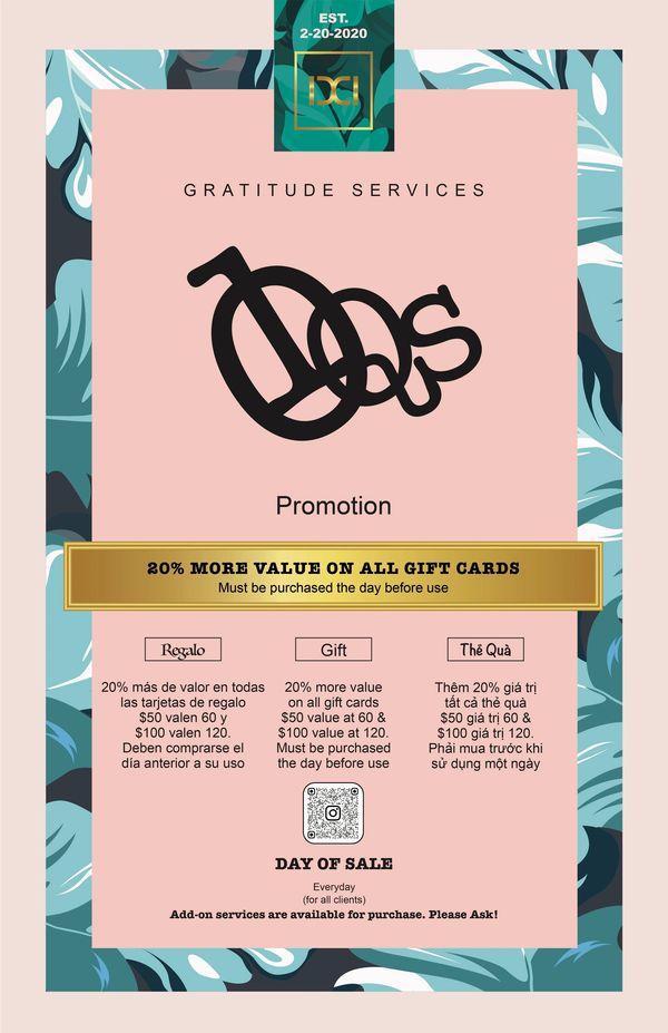 Enjoy 20% more value on all gift cards for all clients. Must be purchased the day before use and cannot use with any other promotions. Offer valid everyday.