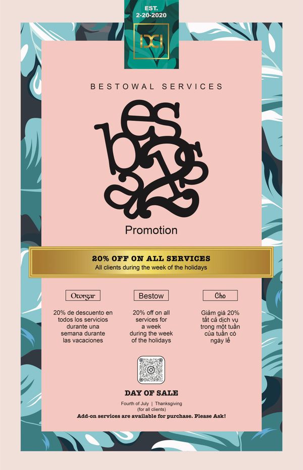 Enjoy 20% off all services for all clients. Offer valid during the week of the holidays: Fourth of July (7/4), Thanksgiving (11/25).