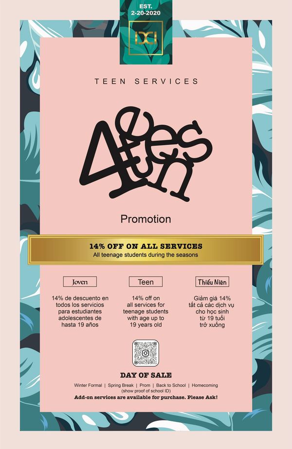 Enjoy 14% off all services for teenagers with age up to 19 years old. Offer valid during seasons: Winter formal, Spring break, Prom, Back to school, Homecoming.