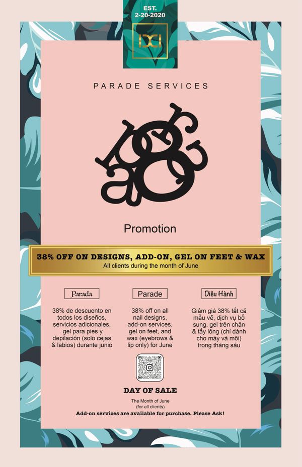 Enjoy 38% off all nail designs, add-on services, gel polish on feet, and waxing (eyebrows and lips only) for all clients in celebration of Pride Month. Offer valid for the month of June.