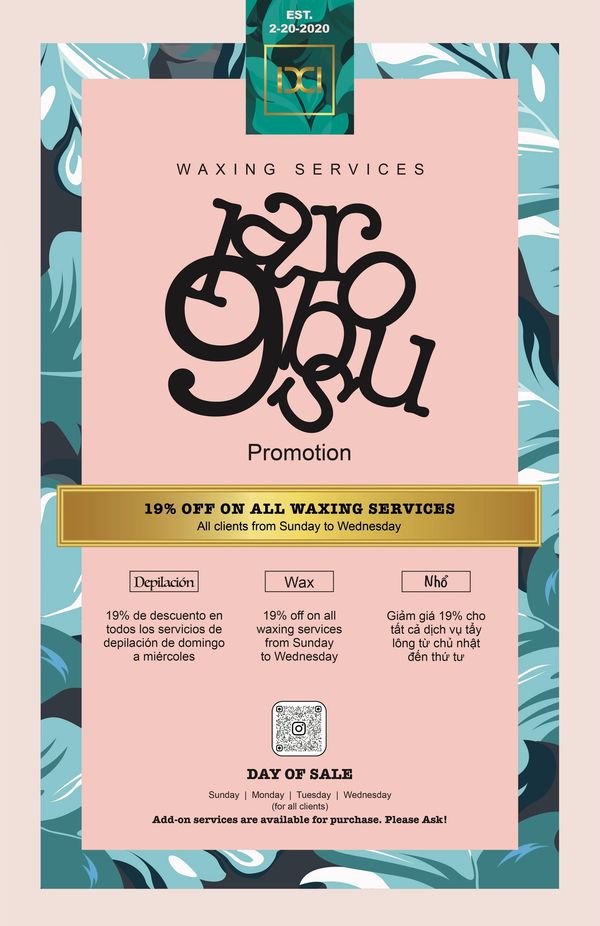 Enjoy 19% off all waxing services for all clients. Offer valid from Sunday, Monday, Tuesday, and Wednesday.